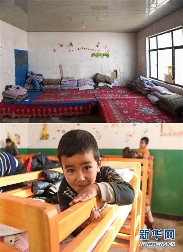 拼版照片:上圖為易地扶貧搬遷前的于田縣達(dá)里雅布依鄉(xiāng)學(xué)校學(xué)生宿舍(2018年9月5日攝);下圖為5歲的阿不都沙拉木·庫爾班在新學(xué)校午休(2019年11月19日攝)。新華社記者胡虎虎攝