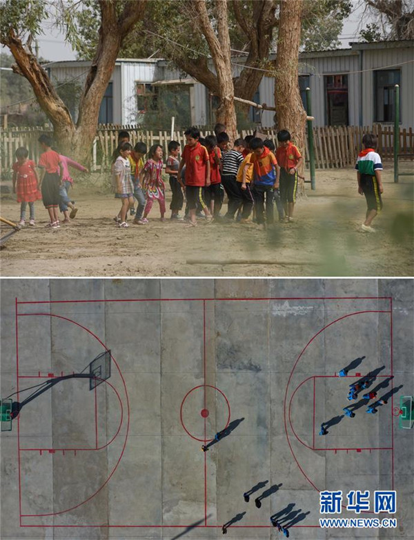 拼版照片:上圖為學(xué)生利用課間時間在平整易地扶貧搬遷前的校園操場(2018年9月6日攝);下圖為學(xué)生們在于田縣達(dá)里雅布依鄉(xiāng)易地扶貧搬遷安置點的水泥操場上打籃球(2019年11月19日無人機拍攝)。新華社記者胡虎虎攝