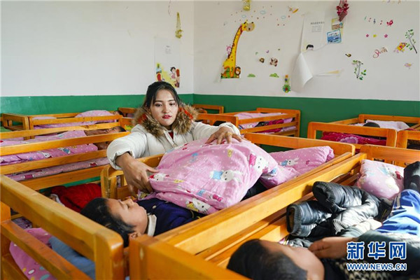11月19日,在新疆于田縣達(dá)里雅布依鄉(xiāng)易地扶貧搬遷安置點的新幼兒園,老師依巴代提·買斯迪克在照顧中班的孩子們睡午覺。在該校位于塔克拉瑪干沙漠腹地的舊址,孩子們平時只能在大通鋪上休息,而在新校舍,每個孩子都有自己的木床睡。新華社記者沈伯韓攝