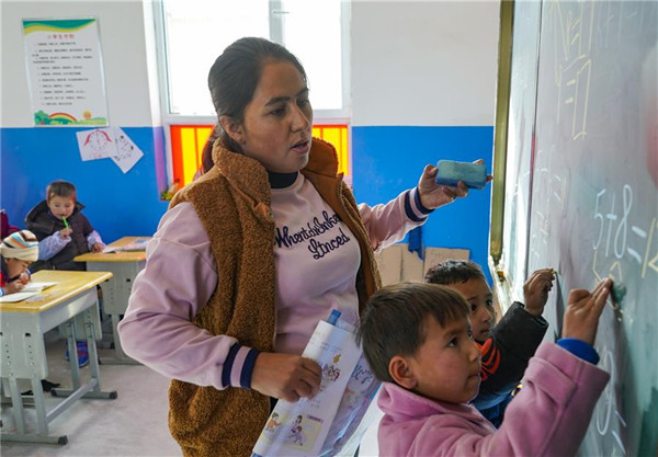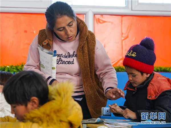 11月19日,在新疆于田縣達(dá)里雅布依鄉(xiāng)易地扶貧搬遷安置點的新學(xué)校,數(shù)學(xué)老師艾比拜木·吾布力艾山(中)在輔導(dǎo)一年級學(xué)生做計算題。新華社記者沈伯韓攝
