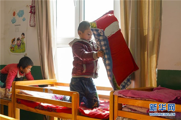 11月19日,在新疆于田縣達(dá)里雅布依鄉(xiāng)易地扶貧搬遷安置點的新幼兒園,中班孩子買買提·買和木提(右)整理枕頭被褥準(zhǔn)備睡午覺。在該校位于塔克拉瑪干沙漠腹地的舊址,孩子們平時只能在大通鋪上休息,而在新校舍,每個孩子都有自己的木床睡。新華社記者沈伯韓攝