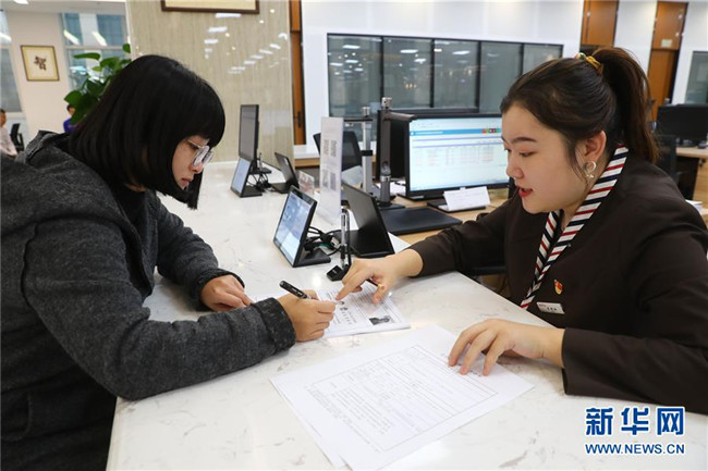 11月23日,在遼寧沈撫新區(qū)政務(wù)服務(wù)中心,工作人員(右)協(xié)助辦事人辦理業(yè)務(wù)。新華社記者 龔兵 攝