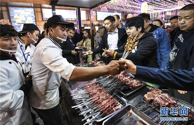 在烏魯木齊五一星光夜市,人們排隊(duì)購買烤羊肉串等美食(5月6日攝)。 新華社記者 王菲 攝
