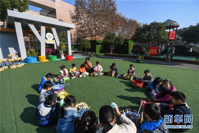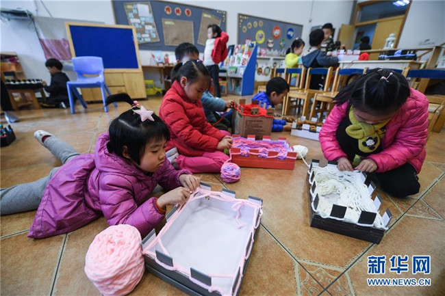 12月11日,小朋友用紙盒制作的工具編織愛(ài)心圍巾。 新華社記者 徐昱 攝