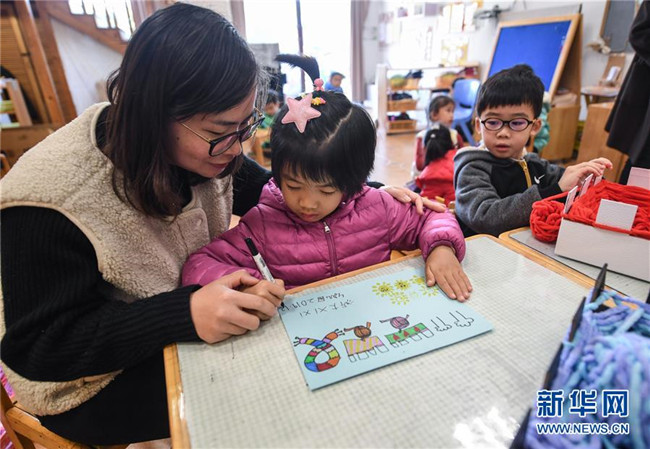 12月11日,小朋友在老師的帶領(lǐng)下繪制愛(ài)心卡片,準(zhǔn)備隨圍巾一起寄給西藏的小朋友們。 新華社記者 徐昱 攝