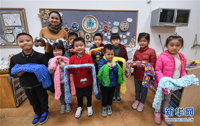12月11日,小朋友們和老師一起展示編織好的愛(ài)心圍巾。 新華社記者 徐昱 攝