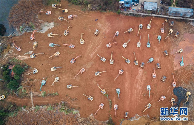 1月26日,在武漢雷神山醫(yī)院建設(shè)工地,大型機(jī)械加緊施工(無(wú)人機(jī)照片)。新華社記者 肖藝九 攝