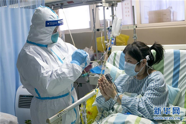 1月24日,在武漢大學(xué)中南醫(yī)院重癥隔離病房,中南醫(yī)院重癥醫(yī)學(xué)科主任彭志勇(左)與病情好轉(zhuǎn)的患者黃淑麗互道新春快樂(lè)。新華社記者 熊琦 攝