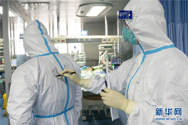 1月24日,在武漢大學(xué)中南醫(yī)院重癥隔離病房,醫(yī)護(hù)人員在隔離服上寫下名字,方便辨認(rèn)。新華社記者 熊琦 攝