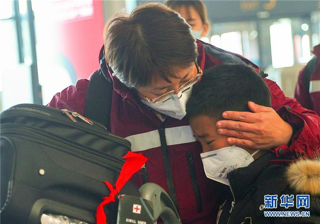 1月26日,遼寧省醫(yī)療隊(duì)隊(duì)員、大連市友誼醫(yī)院呼吸內(nèi)科醫(yī)生王利菊(左)在出發(fā)前與兒子告別。當(dāng)日,遼寧省醫(yī)療隊(duì)出征,137名醫(yī)護(hù)人員從沈陽(yáng)桃仙國(guó)際機(jī)場(chǎng)出發(fā),馳援湖北。新華社記者 龍雷 攝