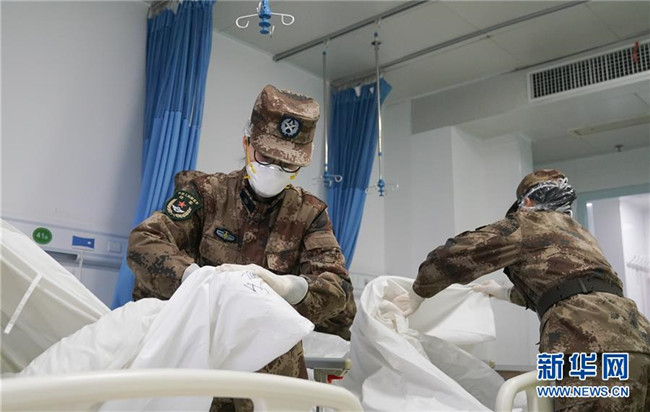 1月26日,陸軍軍醫(yī)大學(xué)醫(yī)療隊(duì)隊(duì)員在武漢市金銀潭醫(yī)院接管病區(qū)清理病房,準(zhǔn)備迎接患者入院。新華社記者 熊琦 攝