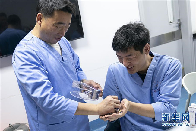 1月24日,武漢大學(xué)中南醫(yī)院重癥醫(yī)學(xué)科主任彭志勇(左)給同事陳少峰分發(fā)糖果,作為年夜飯的“加餐”。 新華社記者 熊琦 攝