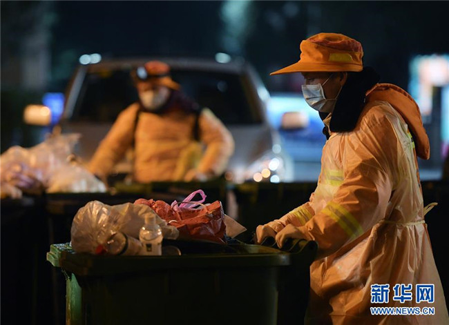 江岸環(huán)衛(wèi)集團(tuán)工作人員在武漢街頭清運(yùn)社區(qū)生活垃圾(2月1日攝)。 新華社記者 李賀 攝