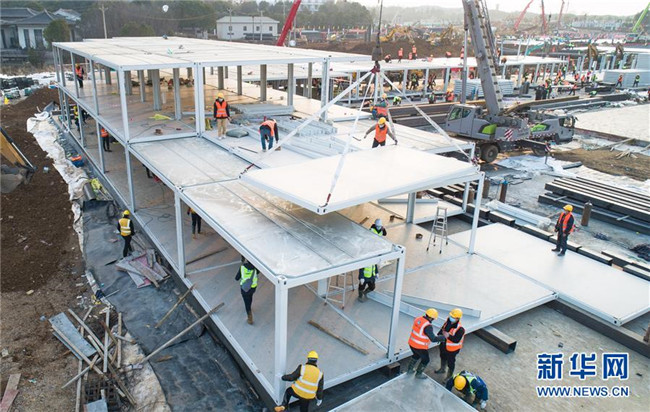 在武漢火神山醫(yī)院建設(shè)工地,來(lái)自中建三局的工人在加緊施工(1月28日攝,無(wú)人機(jī)照片)。 新華社記者 肖藝九 攝
