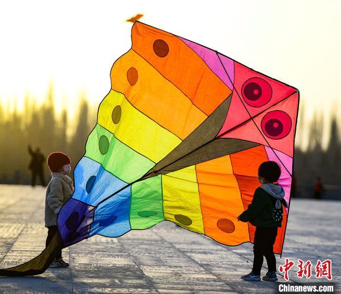 資料圖:3月22日,敦煌市民在敦煌鳴沙山下黨河大橋附近的空地上放風箏。 王斌銀 攝