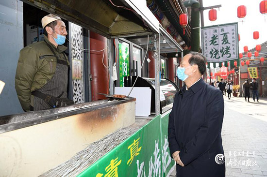 3月29日,自治區(qū)黨委書(shū)記、人大常委會(huì)主任石泰峰在呼和浩特市玉泉區(qū)塞上街了解商戶(hù)經(jīng)營(yíng)情況。內(nèi)蒙古日?qǐng)?bào)社融媒體記者 袁永紅 攝