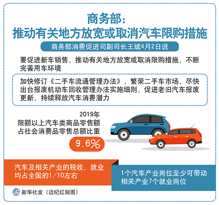 商務(wù)部消費促進司副司長王斌2日說,要促進新車銷售,推動有關(guān)地方放寬或取消限購措施,不斷完善用車環(huán)境,加快修訂《二手車流通管理辦法》,繁榮二手車市場,盡快出臺報廢機動車回收管理辦法實施細(xì)則,促進老舊汽車報廢更新,持續(xù)釋放汽車消費潛力。