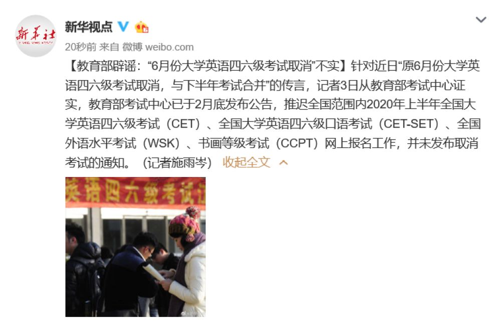 針對(duì)近日“原6月份大學(xué)英語(yǔ)四六級(jí)考試取消,與下半年考試合并”的傳言,記者3日從教育部考試中心證實(shí),教育部考試中心已于2月底發(fā)布公告,推遲全國(guó)范圍內(nèi)2020年上半年全國(guó)大學(xué)英語(yǔ)四六級(jí)考試(CET)、全國(guó)大學(xué)英語(yǔ)四六級(jí)口語(yǔ)考試(CET-SET)、全國(guó)外語(yǔ)水平考試(WSK)、書(shū)畫(huà)等級(jí)考試(CCPT)網(wǎng)上報(bào)名工作,并未發(fā)布取消考試的通知。