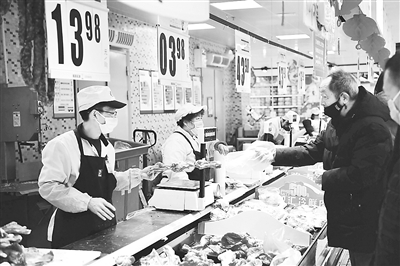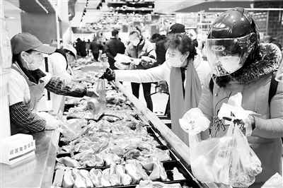 近來,各地采取多種措施,在疫情防控期間保障豬肉市場供應,滿足居民消費需求。圖為市民在河南省鄭州市一家大型超市內(nèi)采購豬肉。新華社記者 馮大鵬攝