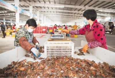 走進(jìn)湖北潛江小龍蝦交易中心,眼前一派忙碌景象。500多家水產(chǎn)商戶已經(jīng)復(fù)工,工人們忙著分揀包裝,成箱的小龍蝦被裝上物流車輛,運(yùn)往全國各地。