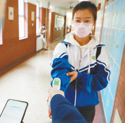 “先找到班級(jí)固定位置,根據(jù)地面標(biāo)記有間隔地排隊(duì)。”寧珂菡熟練地向記者介紹,“挨個(gè)進(jìn)入值班室后,面朝機(jī)器進(jìn)行人臉識(shí)別,然后登記信息、測(cè)量體溫,一切正常才能入校。”
