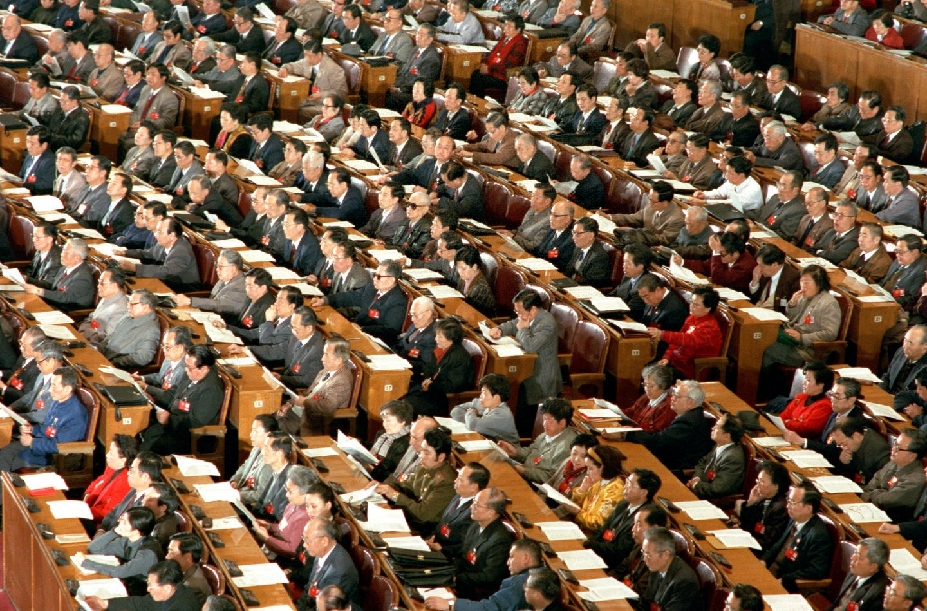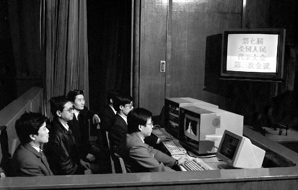 1990年3月,工作人員在七屆全國人大三次會(huì)議上監(jiān)視電子表決系統(tǒng)的運(yùn)轉(zhuǎn)情況。這套電子表決系統(tǒng)有報(bào)到、表決和即席發(fā)言3種功能。這是首次啟用電子表決器。