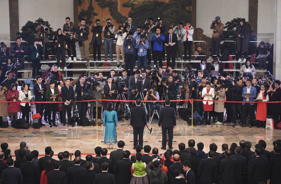 2018年3月20日,十三屆全國人大一次會(huì)議在北京人民大會(huì)堂舉行閉幕會(huì)。這次全國兩會(huì)首設(shè)“代表通道”,圖為記者在“代表通道”采訪。
