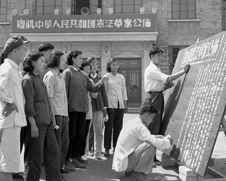 1954年6月,北京市各界人民熱烈擁護(hù)《中華人民共和國憲法草案》。圖為北京國營第一棉紡織廠工人們,獲悉《中華人民共和國憲法草案》公布的消息后,立刻出版黑板報(bào)宣傳。