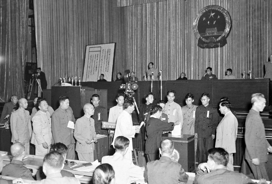 1954年9月15日至28日,第一屆全國人民代表大會(huì)第一次會(huì)議在北京舉行。會(huì)議通過了第一部《中華人民共和國憲法》,并根據(jù)憲法規(guī)定,選舉和決定了國家領(lǐng)導(dǎo)工作人員。毛澤東被選為中華人民共和國主席,朱德為副主席;劉少奇為全國人民代表大會(huì)常務(wù)委員會(huì)委員長(zhǎng),宋慶齡等十三人為副委員長(zhǎng),根據(jù)毛澤東主席的提名,大會(huì)決定周恩來為中華人民共和國國務(wù)院總理。圖為大會(huì)閉幕式的主席臺(tái)。