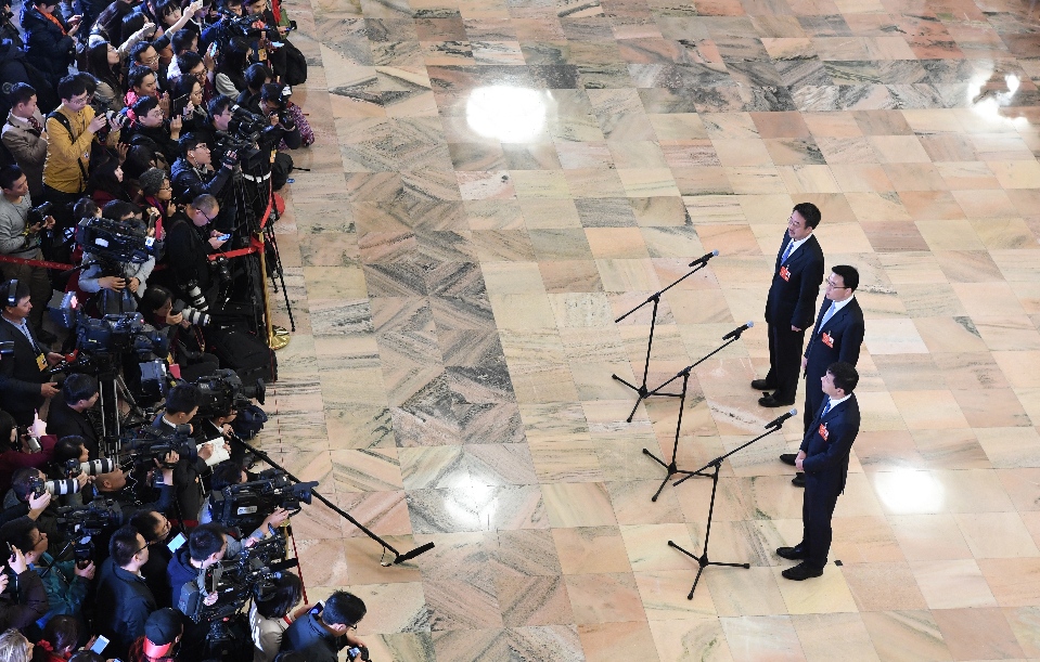 2018年3月15日,全國政協(xié)十三屆一次會(huì)議在北京人民大會(huì)堂舉行閉幕會(huì)。這次全國兩會(huì)首設(shè)“委員通道”,圖為全國政協(xié)委員在“委員通道”接受采訪。