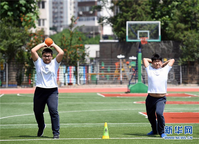 5月28日,北京市第十八中學初三年級的學生在體育課上投擲實心球。新華社記者 任超 攝