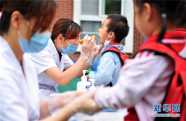 6月2日,成都市龍泉驛區(qū)明慧家美育幼兒園恢復(fù)開園,小朋友們?cè)诮邮苋雸@體檢。 新華社發(fā)(胥冰潔攝)