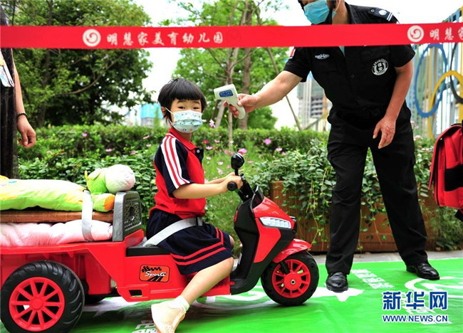 6月2日,成都市龍泉驛區(qū)明慧家美育幼兒園恢復(fù)開園,小朋友在測(cè)量體溫。新華社發(fā)(胥冰潔攝)