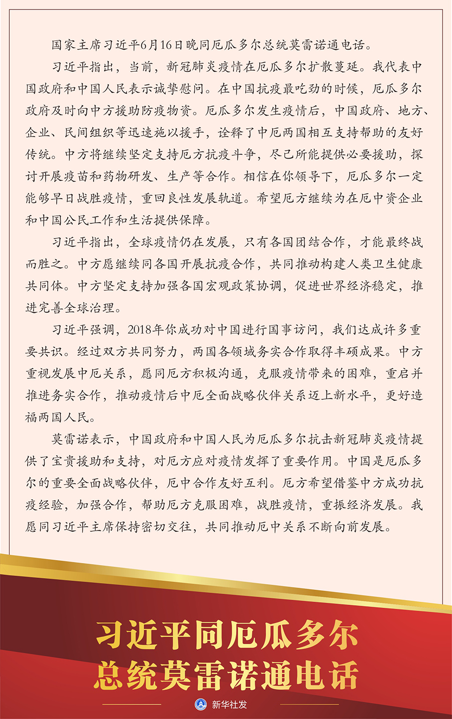 國(guó)家主席習(xí)近平6月16日晚同厄瓜多爾總統(tǒng)莫雷諾通電話。