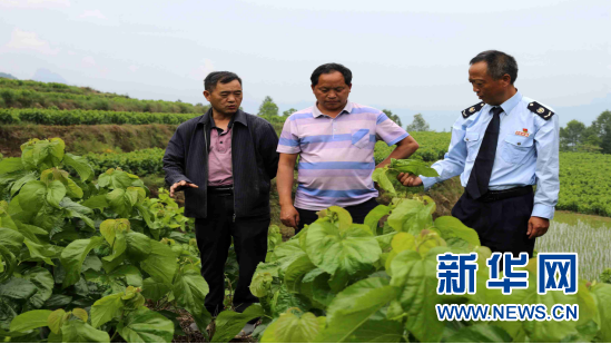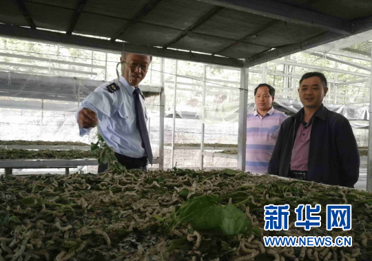 養(yǎng)蠶大戶鄧遂洪(左一)介紹桑樹防蟲技術。新華網(wǎng)發(fā)(重慶稅務供圖)