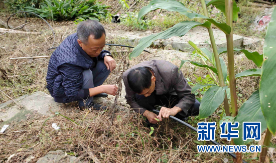 張紹淦(左一)在山上檢查自來水管道。新華網(wǎng)發(fā)(重慶稅務供圖)