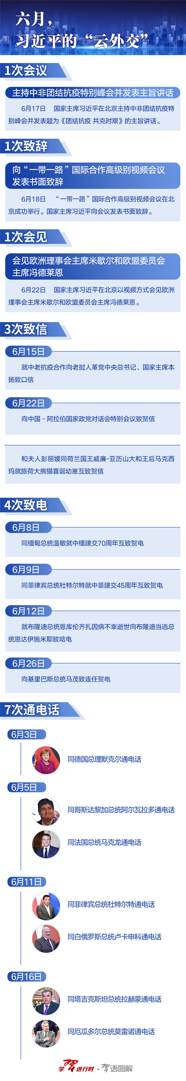 6月,習(xí)近平同德國(guó)總理默克爾、法國(guó)總統(tǒng)馬克龍、哥斯達(dá)黎加總統(tǒng)阿爾瓦拉多等外國(guó)領(lǐng)導(dǎo)人通電話;向中國(guó)-阿拉伯國(guó)家政黨對(duì)話會(huì)特別會(huì)議致賀信;以視頻方式主持中非團(tuán)結(jié)抗疫特別峰會(huì)、會(huì)見(jiàn)歐洲理事會(huì)主席米歇爾和歐盟委員會(huì)主席馮德萊恩……