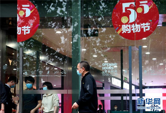 這是上海淮海路一家商場的“五五購物節(jié)”標(biāo)識(5月5日攝)。5月4日晚,上海首次啟動大規(guī)模商業(yè)促銷活動“五五購物節(jié)”,多家在線新經(jīng)濟(jì)企業(yè)參與。 新華社記者 劉穎 攝