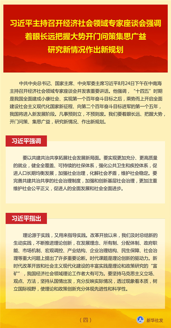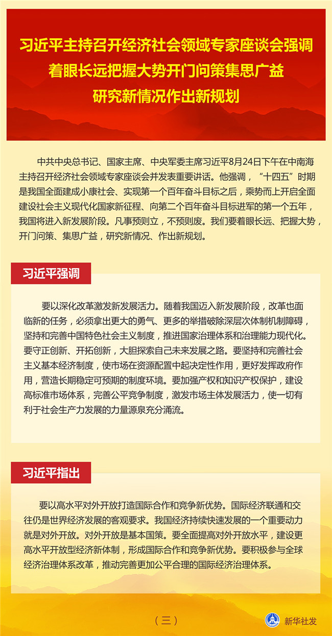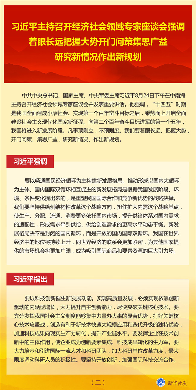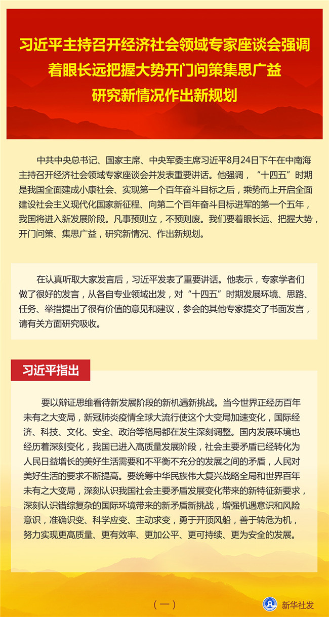 中共中央總書記、國家主席、中央軍委主席習(xí)近平8月24日下午在中南海主持召開經(jīng)濟(jì)社會領(lǐng)域?qū)<易剷l(fā)表重要講話。他強(qiáng)調(diào),“十四五”時期是我國全面建成小康社會、實(shí)現(xiàn)第一個百年奮斗目標(biāo)之后,乘勢而上開啟全面建設(shè)社會主義現(xiàn)代化國家新征程、向第二個百年奮斗目標(biāo)進(jìn)軍的第一個五年,我國將進(jìn)入新發(fā)展階段。凡事預(yù)則立,不預(yù)則廢。我們要著眼長遠(yuǎn)、把握大勢,開門問策、集思廣益,研究新情況、作出新規(guī)劃。