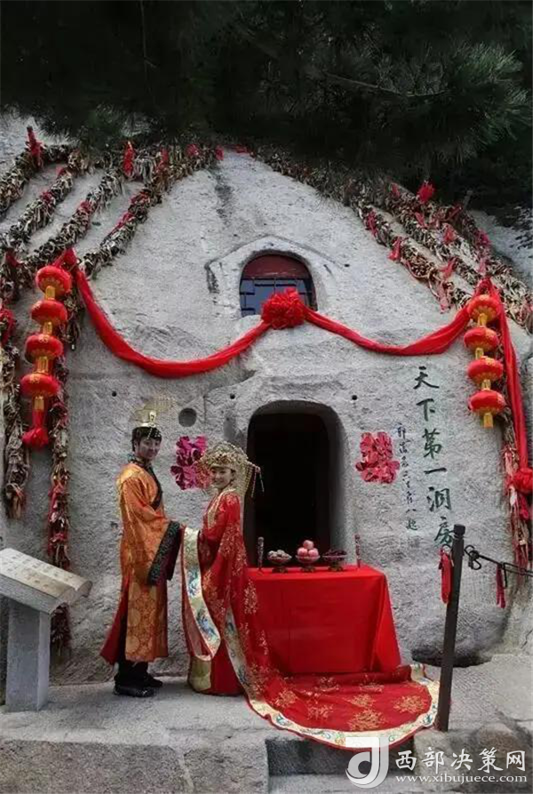 相傳春秋時(shí)期在華山修行的吹簫人簫史和秦穆公的女兒弄玉就是在華山西峰鑿洞成婚,“洞房”一詞由此誕生。天下第一洞房位于華山西峰東側(cè)半腰,從蓮花橋經(jīng)十八譚登山路的左側(cè)即達(dá),多少年來,一對(duì)對(duì)相濡以沫的夫妻,一雙雙初次相識(shí)的戀人,攜手并肩,登頂華山,汲西峰洞房瑞氣,沐東峰朝陽祥光,恩恩愛愛漫步人生幸福路。