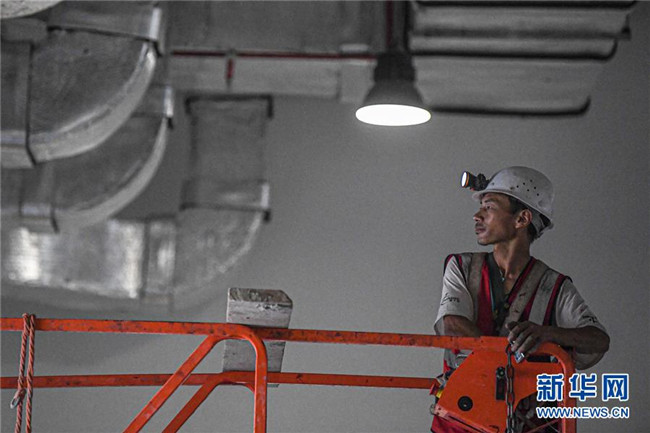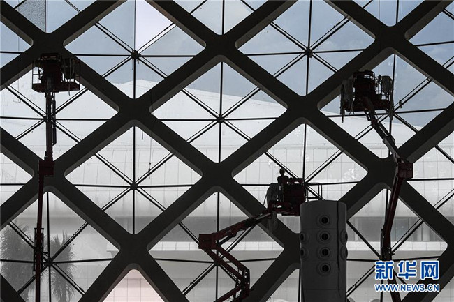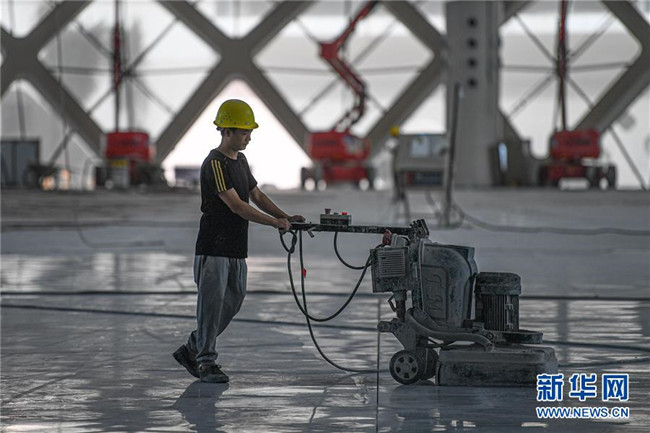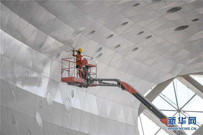 8月25日,工人在位于??诘暮D蠂H會展中心二期項目施工。新華社記者 蒲曉旭 攝