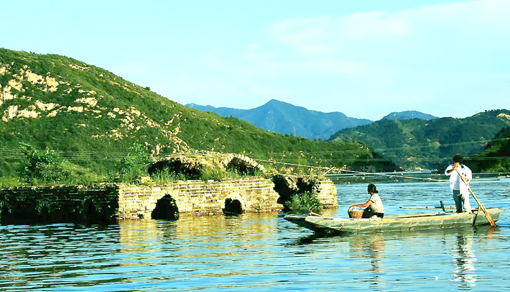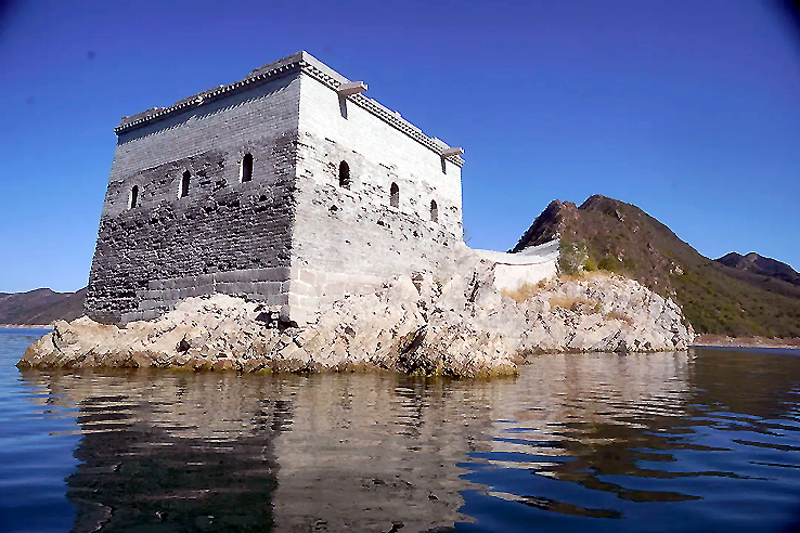 1975年至1981年,為了給天津供水,利用這里的山形地勢(shì),在灤河上游寬城、遷西、興隆三縣交界處,修建了潘家口水庫。引灤入津工程橫切長(zhǎng)城,喜峰口、潘家口兩座雄關(guān)鑲?cè)胍惶侗滩?,從而形成萬里長(zhǎng)城一處絕景——“水下長(zhǎng)城”。