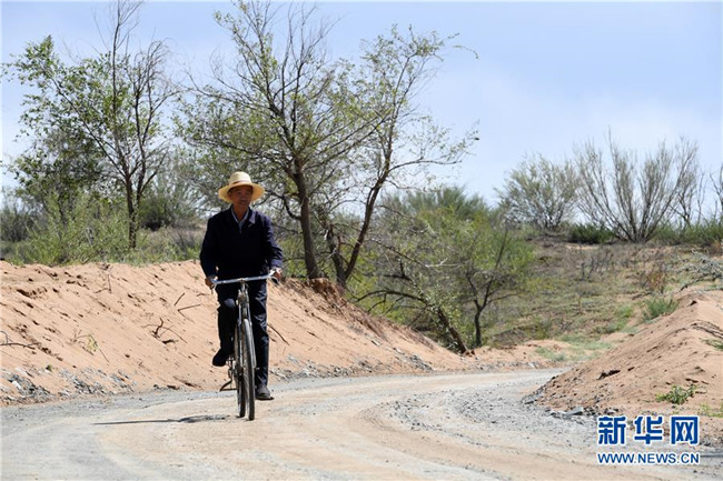 在古浪縣八步沙林場(chǎng),場(chǎng)長(zhǎng)郭萬剛騎著自行車巡護(hù)林場(chǎng)(9月1日攝)。 新華社記者 范培珅 攝