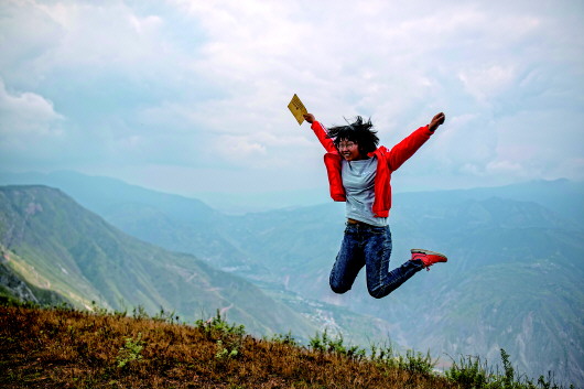 今年高考理科644分的會澤縣考生范天蘭,拿著通知書開心得蹦起來。(9月8日攝)記者江文耀攝