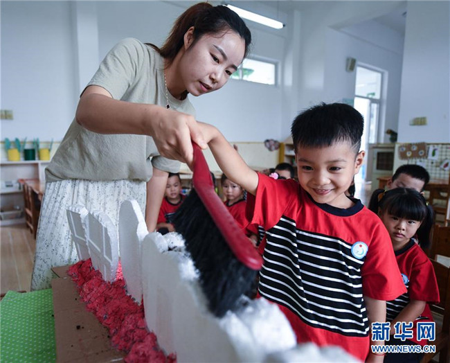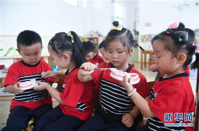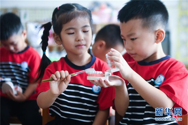9月16日,孩子在學習正確的刷牙方式。新華社記者 徐昱 攝