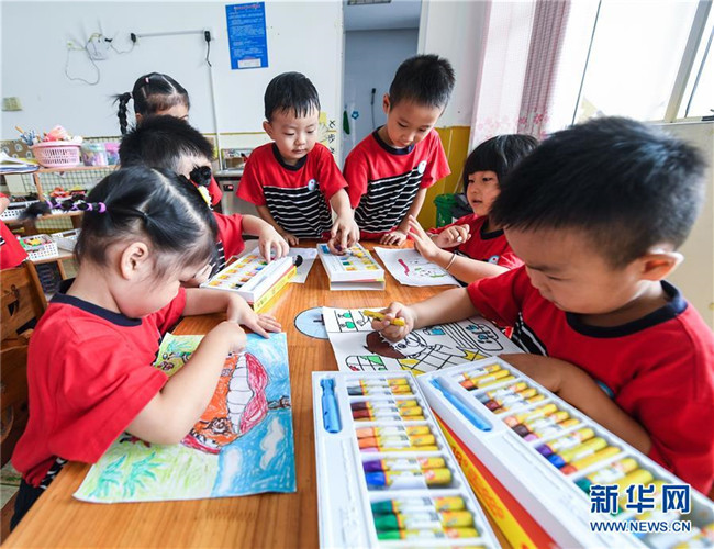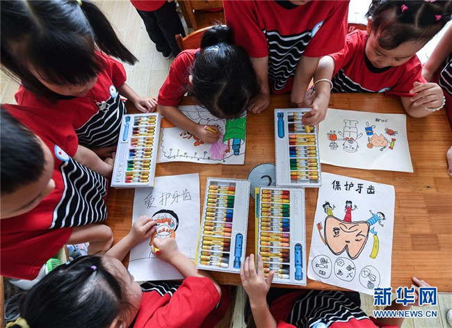 9月16日,孩子們在畫愛牙日主題宣傳畫。新華社記者 徐昱 攝