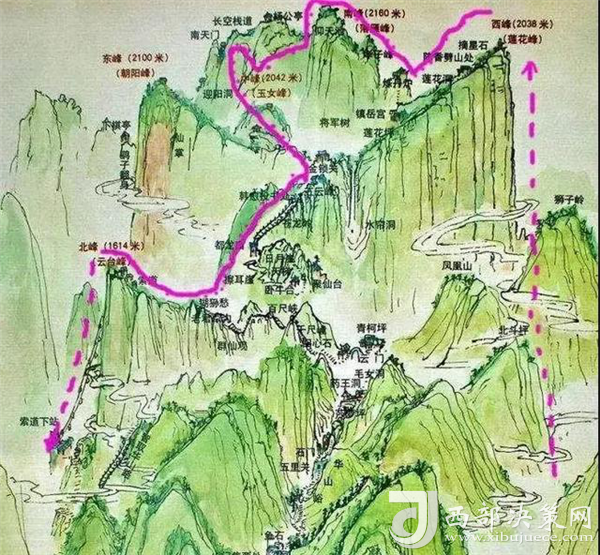 北峰,是華山主峰之一,海拔1614米,因位置居北得名。此峰四面懸絕,上冠景云,下通地脈,巍然獨(dú)秀,有若云臺,又名云臺峰。