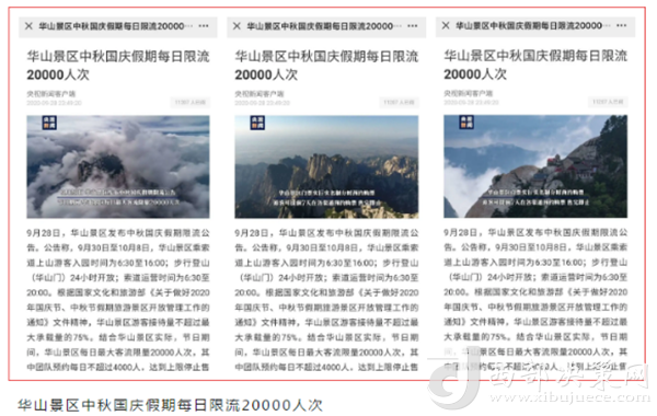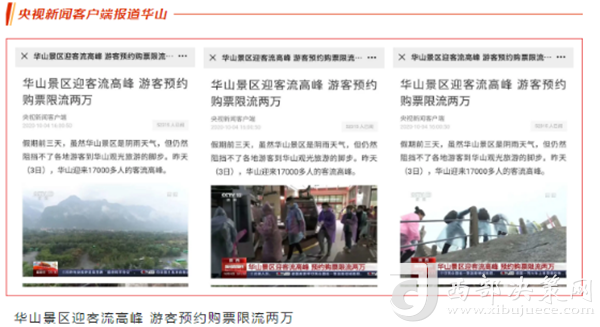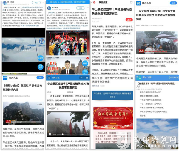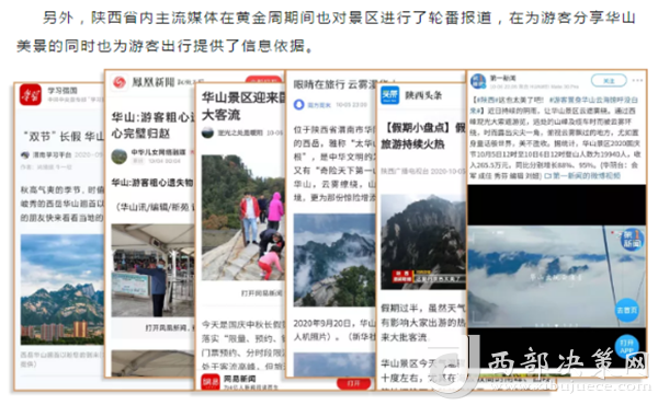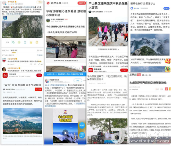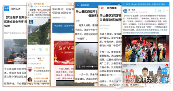 度節(jié)期間,通過央視cctv2【天下財經(jīng)】、cctv4、cctv13【新聞30分】、cctv13【新聞直播間】、央視網(wǎng)【國慶假期·出游】、央視網(wǎng)學(xué)習(xí)強(qiáng)國、央視新聞客戶端、新華社等國家級媒體對景區(qū)度節(jié)工作、游覽秩序、特色服務(wù)等方面進(jìn)行轟炸式報道;聯(lián)合陜西日報、陜西電視臺、渭南日報、渭南電視臺、三秦都市報、陜西旅游資訊、騰訊網(wǎng)、新浪網(wǎng)、網(wǎng)易陜西、鳳凰陜西等30余家主流媒體對景區(qū)度節(jié)期間各項(xiàng)工作及實(shí)時風(fēng)景進(jìn)行跟蹤報道,共計發(fā)布各類宣傳稿件239篇,全面提升景區(qū)旅游熱度。