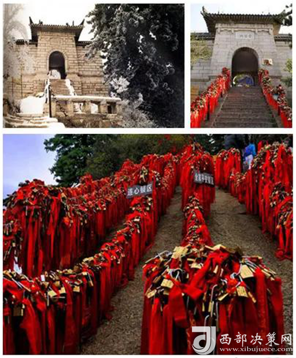 到達(dá)金鎖關(guān)時,眼前大片大片的紅色,游人的視覺和心靈受到強烈的沖擊。這是沿路兩邊鐵鏈上綁滿的密密麻麻的紅色絲繩,不留一絲空隙,風(fēng)吹來,長長的紅色絲繩就輕盈的舞起來,如愛情牢固的臂膀,甜蜜的飛翔在華山之上。讓一把感情鎖和華山一同到地老天荒,成為一個“山無陵,天地絕,乃敢與君絕”的千古情愛神話。