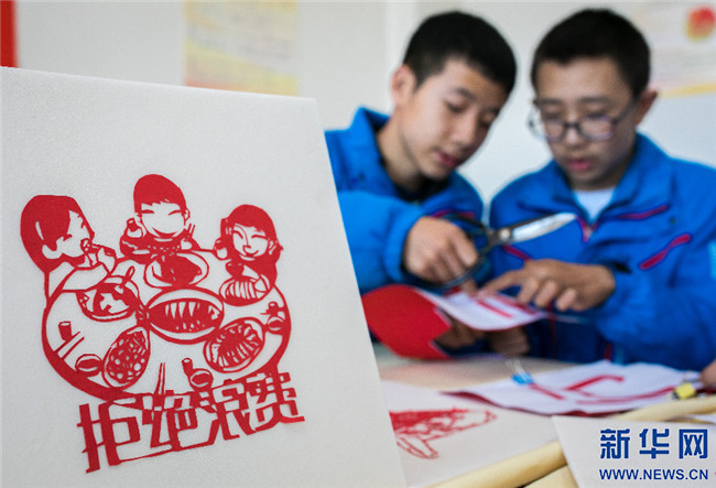 15日,內蒙古呼和浩特市第二十六中學學生制作以“世界糧食日”為主題的剪紙作品。新華網(wǎng)發(fā)(丁根厚攝)